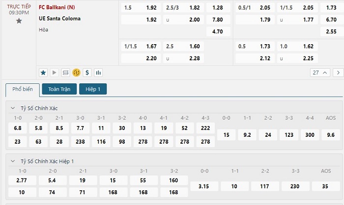 Bảng tỷ lệ kèo bóng đá trận đấu KF Ballkani vs Santa Coloma