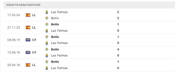 Trong quá khứ tại những lần gặp nhau giữa Las Palmas và Real Betis vốn cũng không thường xuyên diễn ra với nhiều bàn thắng ghi được, có tới 7 trong 10 trận gặp nhau trước đây của hai đội chỉ có từ 2 bàn thắng ghi được trở xuống. Hàng công của Las Palmas và Real Betis tại mùa giải cũng dang gặp nhiều khó khăn trong việc xuyên thủng hàng thủ đối phương, chính bởi vậy mà tỷ số trận đấu sắp tới của hai đội cũng sẽ khó có thể xuất hiện nhiều trong trận.