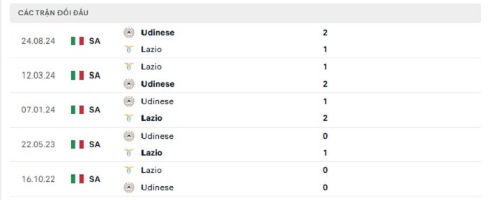 Lịch sử đối đầu của Lazio vs Udinese