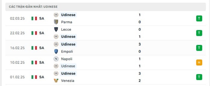 • Phong độ Udinese