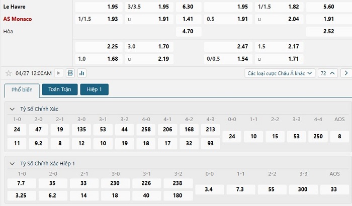 Bảng tỷ lệ kèo bóng đá trận đấu Le Havre vs AS Monaco