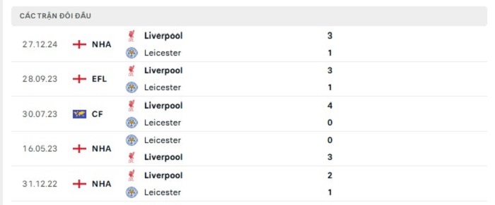 Phong độ gần đây Leicester City vs Liverpool