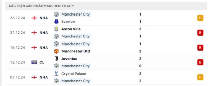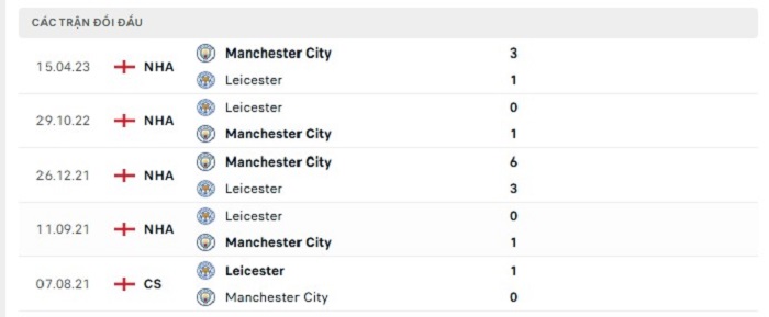 Bảng bóng đá trận đấu Leicester City vs Manchester City