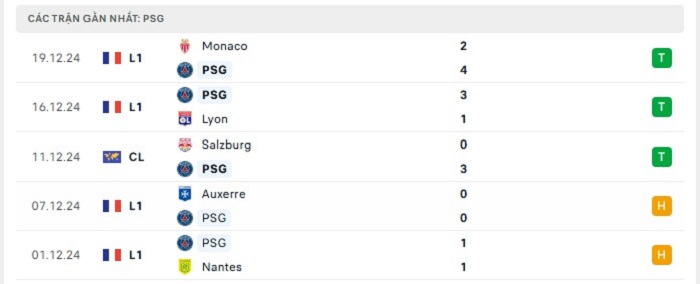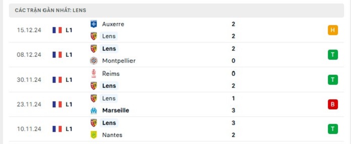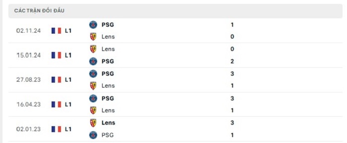 Phong độ gần đây Lens vs Paris Saint-Germain
