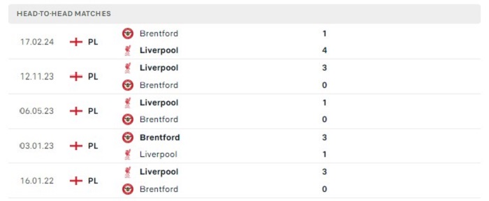 Thống kê trong 6 lần gặp nhau gần đây của hai đội thì có tới 5 trận đấu có được từ 3 bàn thắng ghi được trở lên, trong đó 3 trận đấu có từ 4 bàn thắng ghi được cũng đã cho thấy được lối chơi tấn công đa dạng của Liverpool và Brentford ở những lần đối đầu với nhau trước đó. Trận đấu sắp tới của hai đội cũng vì vậy mà có thể đặt niềm tin vào một cuộc diện bùng nổ về mặt tỷ số cho cả hai đội.
