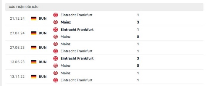 Lịch sử đối đầu của Mainz vs Eintracht Frankfurt