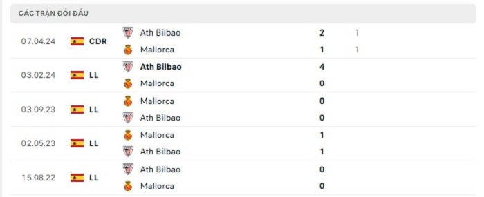 Bảng  bóng đá trận đấu Mallorca vs Athletic Bilbao