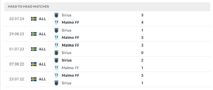 Lịch sử đối đầu của Malmo FF vs IK Sirius