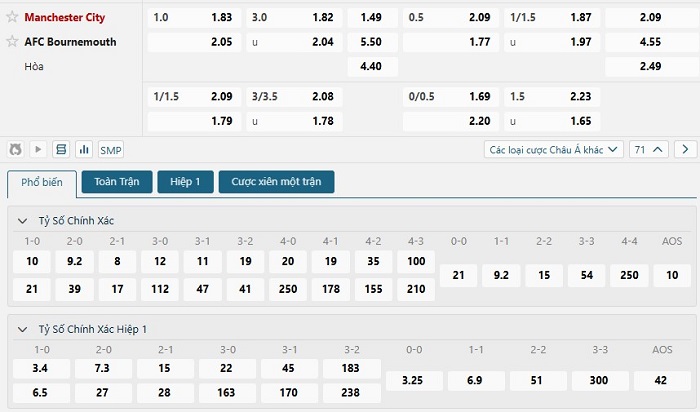 Bảng tỷ lệ kèo bóng đá trận đấu Manchester City vs Bournemouth
