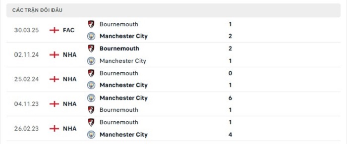 Phong độ gần đây Manchester City vs Bournemouth