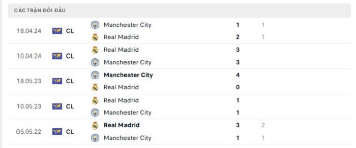 Bảng bóng đá trận đấu Manchester City vs Real Madrid