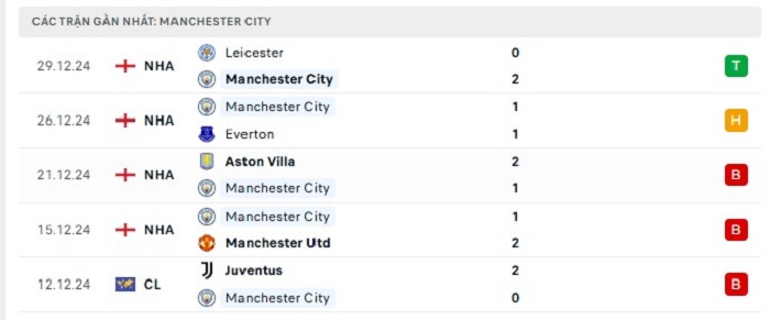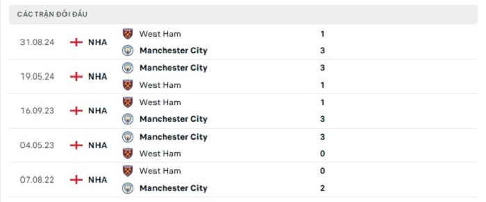 Bảng bóng đá trận đấu Manchester City vs West Ham United