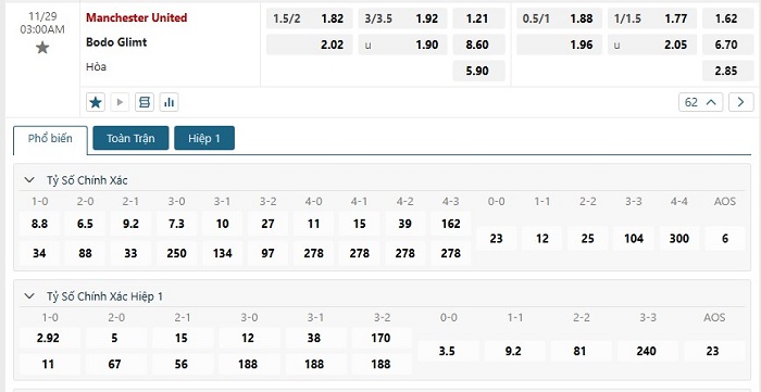Soi kèo tỷ số Manchester United vs Bodo Glimt