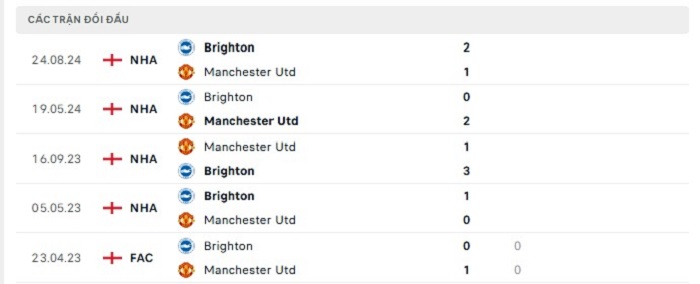 Lịch sử đối đầu của Manchester United vs Brighton