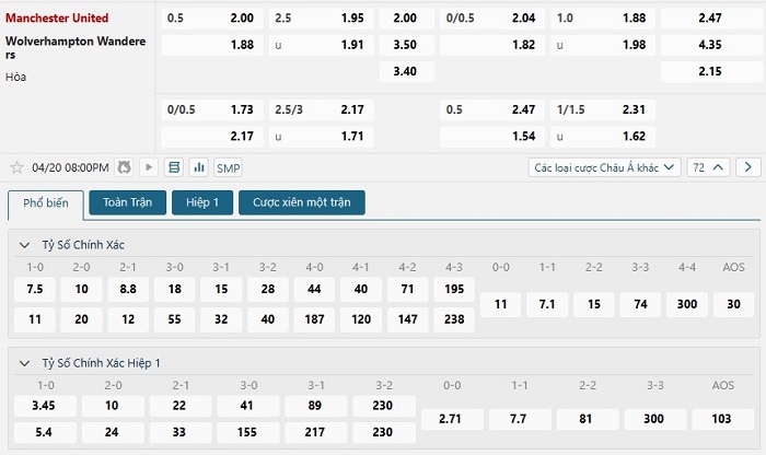 Bảng tỷ lệ kèo bóng đá trận đấu Manchester United vs Wolverhampton
