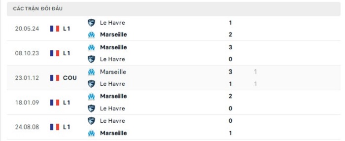 Lịch sử đối đầu của Marseille vs Havre AC
