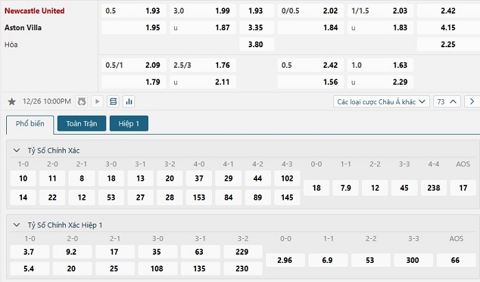 Soi kèo tỷ số Newcastle vs Aston Villa