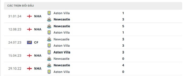 Bảng bóng đá trận đấu Newcastle vs Aston Villa