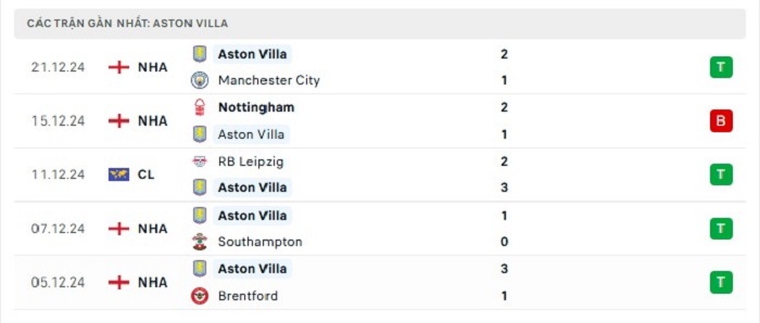 - Phong độ Aston Villa