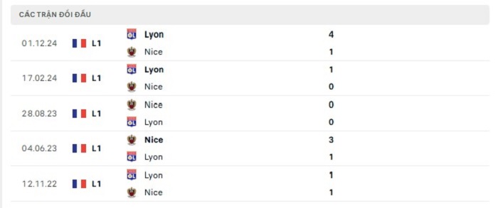 Bảng  bóng đá trận đấu Nice vs Lyon
