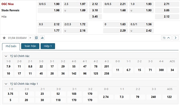 Trong quá khứ Nice vốn cũng đã tạo nên được những thành công đáng kể của mình trước Stade Rennais, bằng chứng cụ thể là trên sân nhà họ có tới 6 trận thắng kèo châu âu trước đối thủ này trong khi chỉ hoà 3 và thua 1 trận đấu. Với Stade Rennais việc có tới 6 thất bại theo kèo châu Âu trong 7 trận sân khách ở mùa giải đang báo động về thành tích nghèo nàn của họ ở giải đấu số 1 nước Pháp mùa này, chính bởi vậy mà có thể đặt niềm tin vào Nice theo mốc kèo châu Âu được niêm yết ở trận đấu.