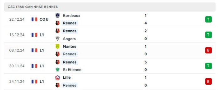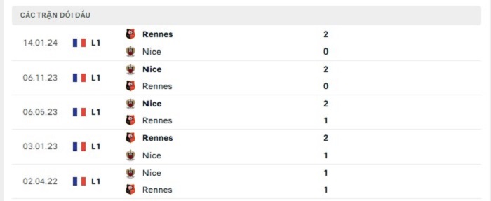 Lịch sử đối đầu của Nice vs Stade Rennais
