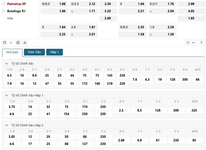 Bảng tỷ lệ kèo bóng đá trận đấu Palmeiras vs Botafogo