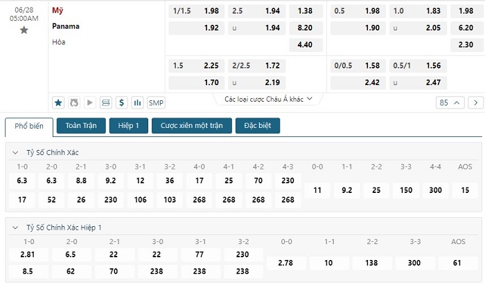 Bảng tỷ lệ kèo bóng đá trận đấu Panama vs Mỹ