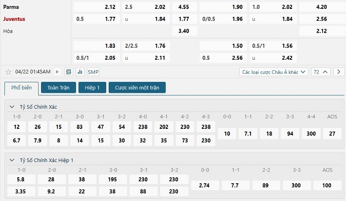 Bảng tỷ lệ kèo bóng đá trận đấu Parma vs Juventus