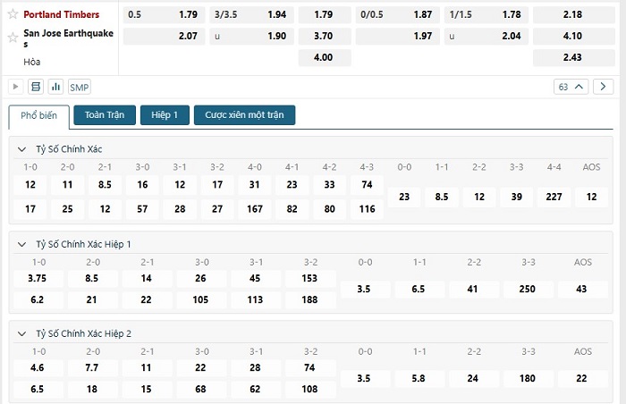 Bảng tỷ lệ kèo bóng đá trận đấu Portland Timbers vs San Jose Earthquakes