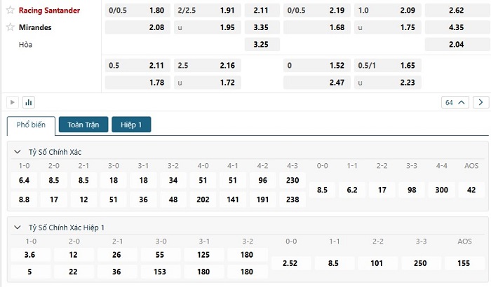 Bảng tỷ lệ kèo bóng đá trận đấu Racing Santander vs Mirandes