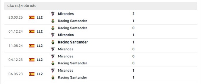Lịch sử đối đầu của Racing Santander vs Mirandes