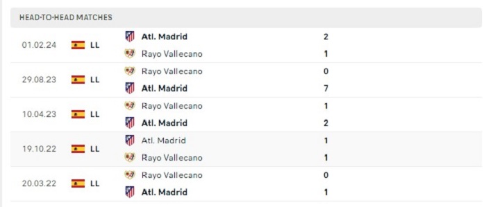 Lịch sử đối đầu của Rayo Vallecano vs Atletico Madrid