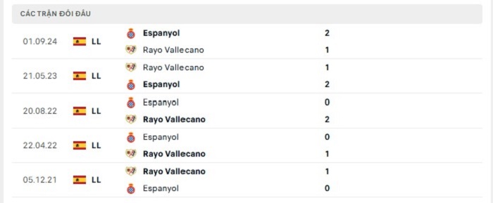Lịch sử đối đầu của Rayo Vallecano vs Espanyol