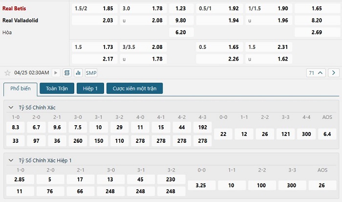 Bảng tỷ lệ kèo bóng đá trận đấu Real Betis vs Real Valladolid
