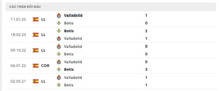 Lịch sử đối đầu của Real Betis vs Real Valladolid