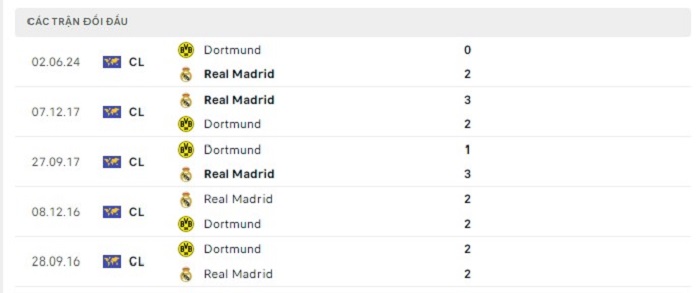 Lịch sử đối đầu của Real Madrid vs Borussia Dortmund