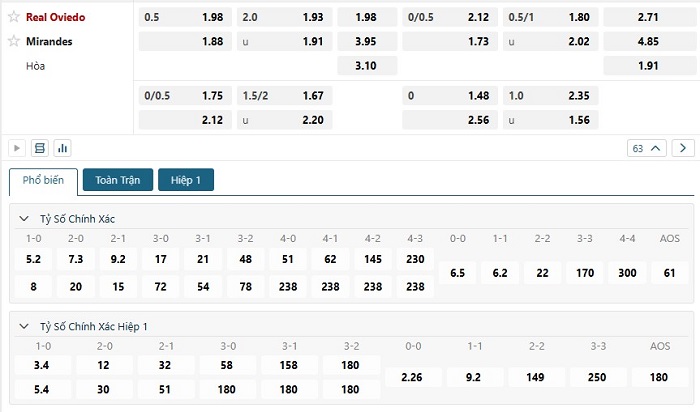 Bảng tỷ lệ kèo bóng đá trận đấu Real Oviedo vs Mirandes