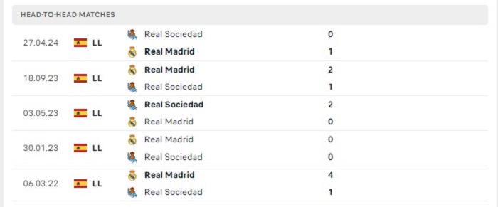 Ở những năm qua Real Sociedad cũng từng tạo nên không ít khó khăn cho Real Madrid, bằng chứng là 10 lần gặp nhau gần đây nhất họ cũng chỉ để thua 5 trận đấu trong khi có được 2 trận thắng và 3 trận hoà kèo châu Âu cả trận. Ở mùa giải này phong độ sân khách của Real Madrid đang gặp nhiều vấn đề rất lớn khi cả 2 vòng đấu của họ đều có kết quả hoà kèo châu Âu của trận, do đó mà khả năng bất phân thắng bại của hai đội tại lần gặp nhau này cũng là khả thi.
