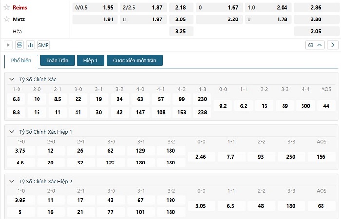 Bảng tỷ lệ kèo bóng đá trận đấu Reims vs Metz