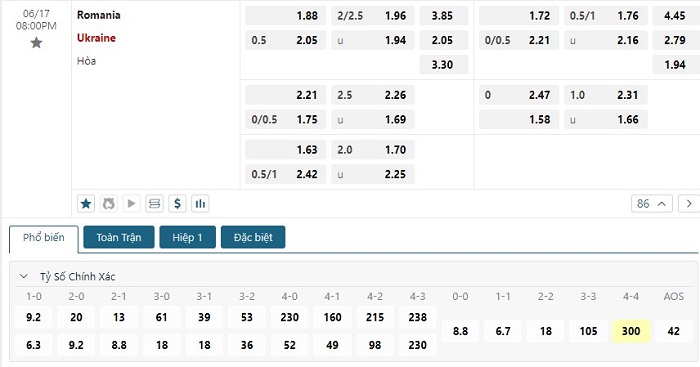 Bảng tỷ lệ kèo bóng đá trận đấu Romania vs Ukraine