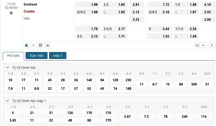 Trong quá quá giữa Scotland và Croatia có được sự cân bằng đáng kể khi mỗi bên đang có được cho mình 2 trận thắng ở 5 lần gặp nhau, tuy nhiên có thể nhận thấy được sự tiến bộ của Croatia khi họ toàn thắng theo kèo châu Âu ở 2 lần gặp Scotland gần đây nhất. Tại bảng đấu này Scotland cũng chưa thể thắng kèo châu Âu trong 4 trận đấu có thể thấy được năng lực hiện tại của họ không được đánh giá cao, do vậy mà khả năng thắng trận của đội khách cũng là rất lớn.
