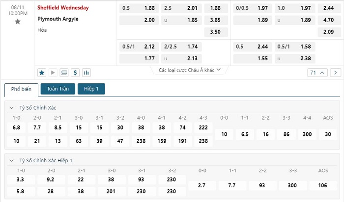 Bảng tỷ lệ kèo bóng đá trận đấu Sheffield Wednesday vs Plymouth Argyle
