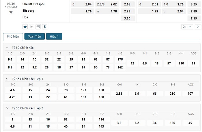Bảng tỷ lệ kèo bóng đá trận đấu Sheriff Tiraspol vs Elfsborg