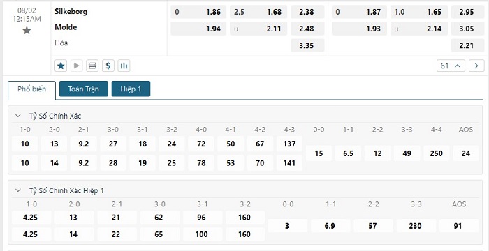 Bảng tỷ lệ kèo bóng đá trận đấu Silkeborg vs Molde