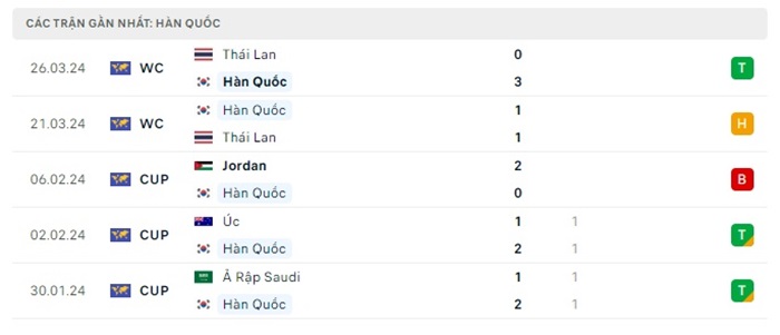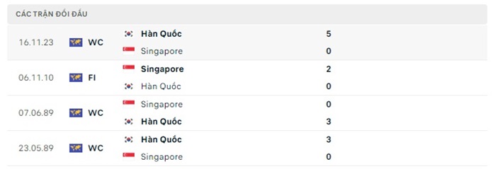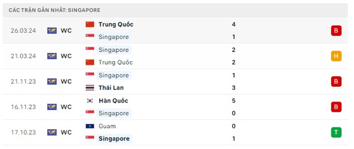 Phong độ gần đây Singapore vs Hàn Quốc