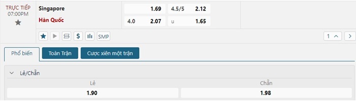 Bảng tỷ lệ kèo bóng đá trận đấu Singapore vs Hàn Quốc