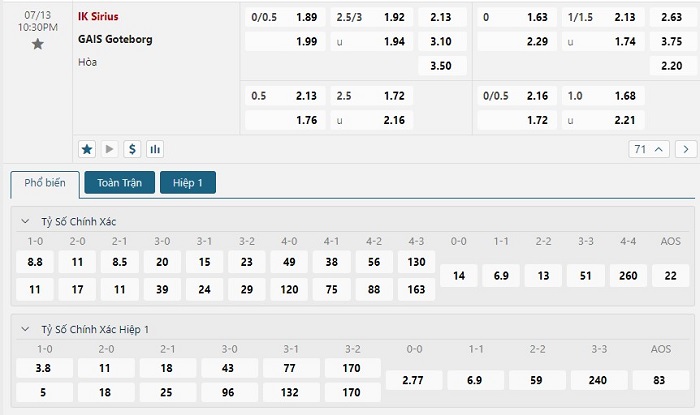 Bảng tỷ lệ kèo bóng đá trận đấu Sirius vs GAIS