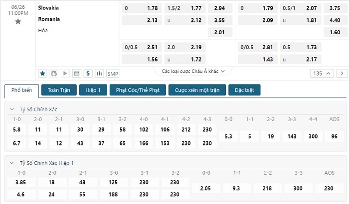 Bảng tỷ lệ kèo bóng đá trận đấu Slovakia vs Romania