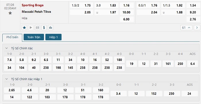 Bảng tỷ lệ kèo bóng đá trận đấu Sporting Braga vs Maccabi Petah Tikva
